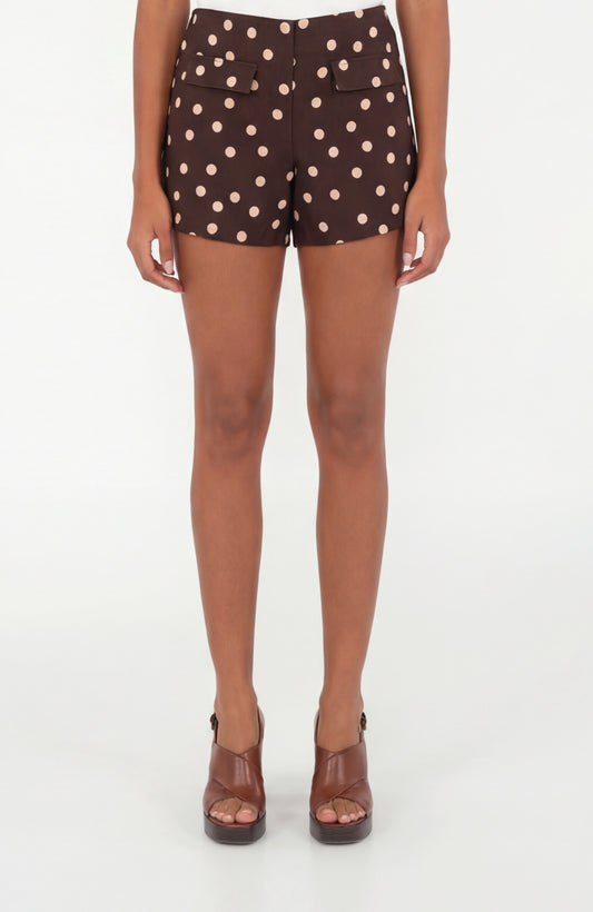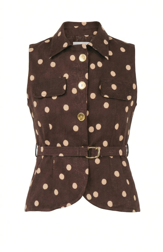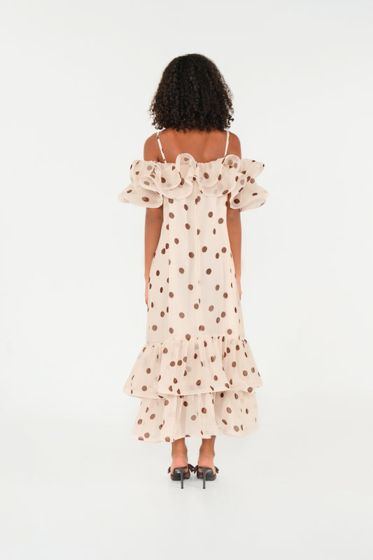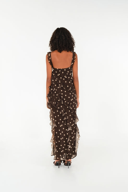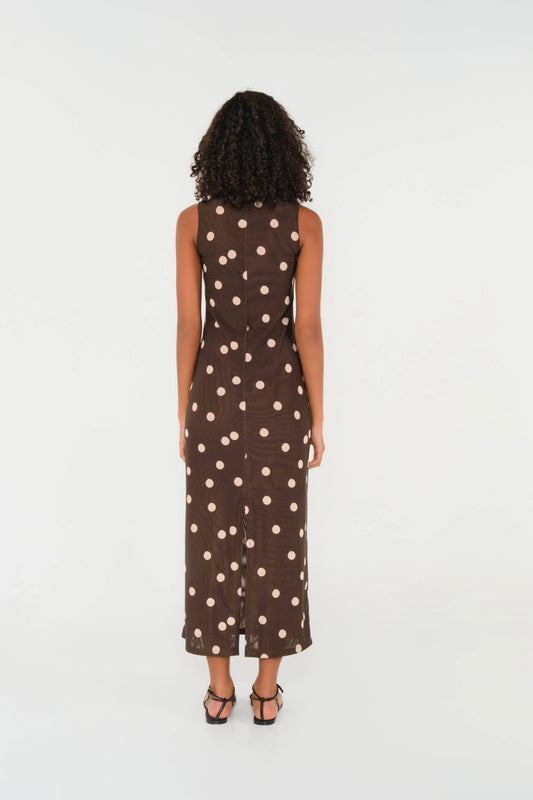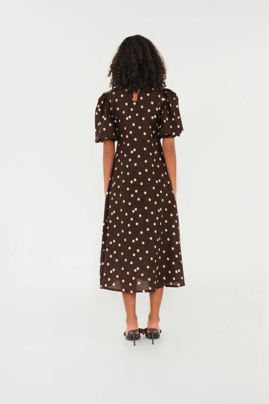 The Dawn Midi Dress in Brown Polka Dot Linen