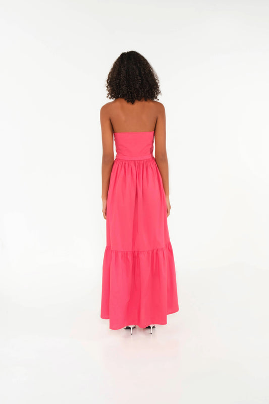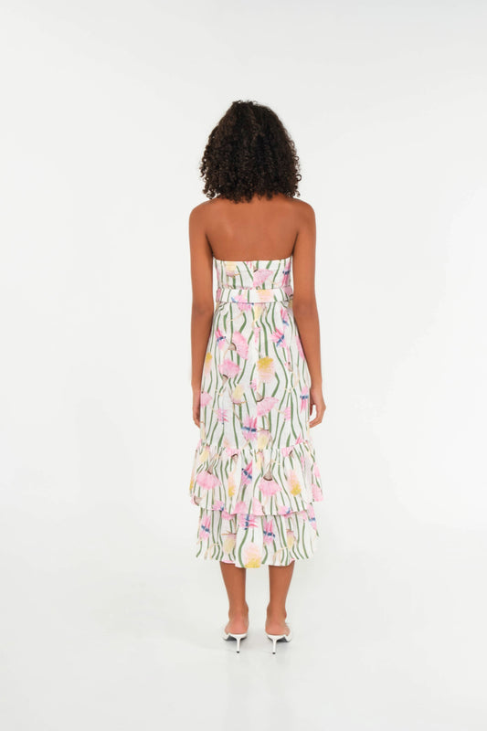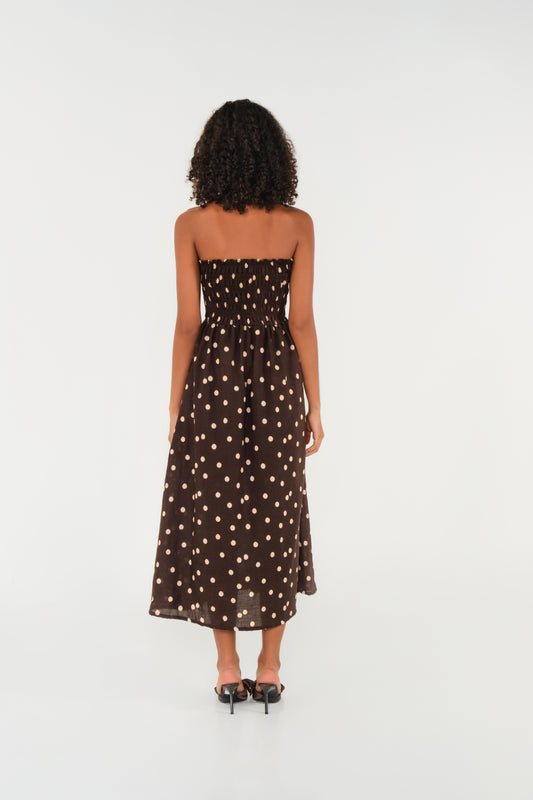 The Drift Strapless Dress in Brown Polka Dot Linen