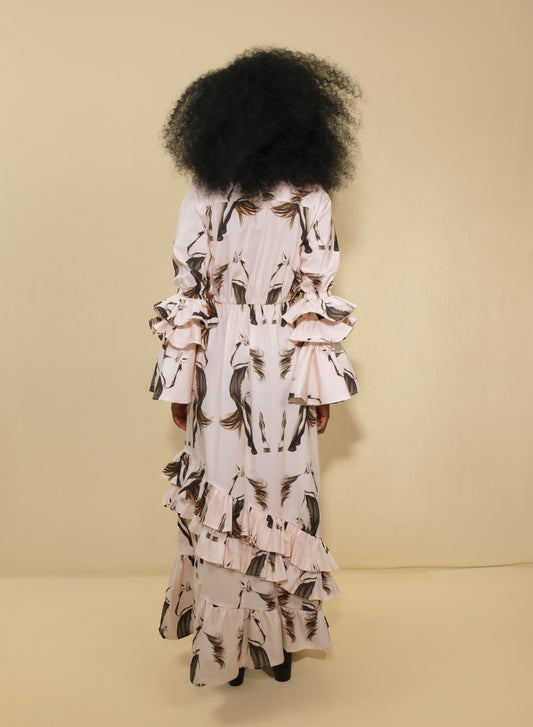 Gaucho Ruffle-Sleeve Poplin Maxi Shirt Dress – Horse Print