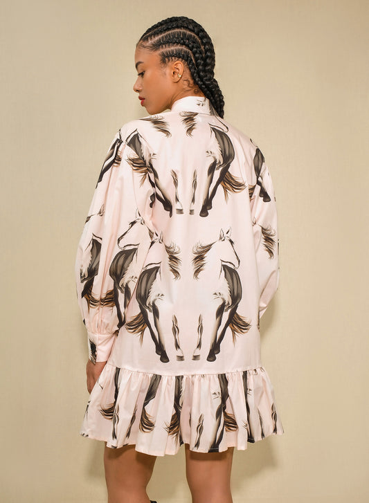 Medellín Poplin Mini Shirt Dress – Horse Print & Puff Sleeves