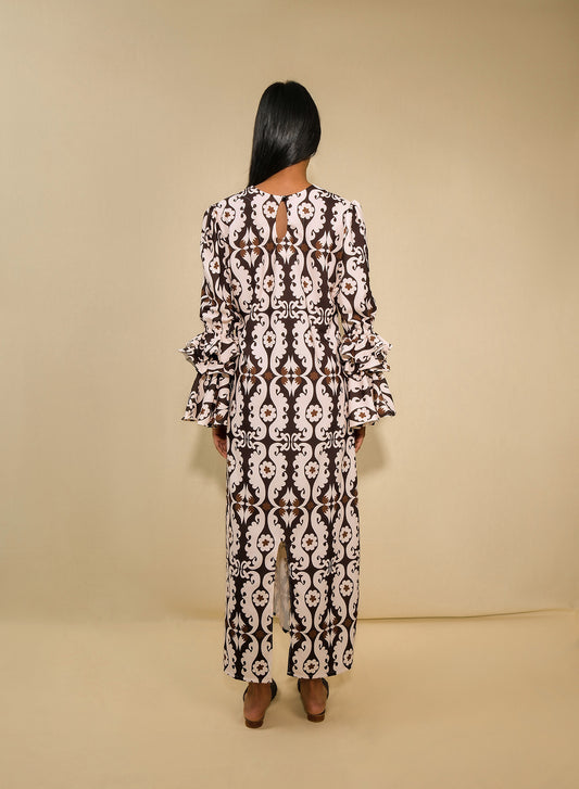 New Makeda Tunic Dress – Ruffle-Sleeve Maxi in Recycled Crepe (Maxi Paisley)