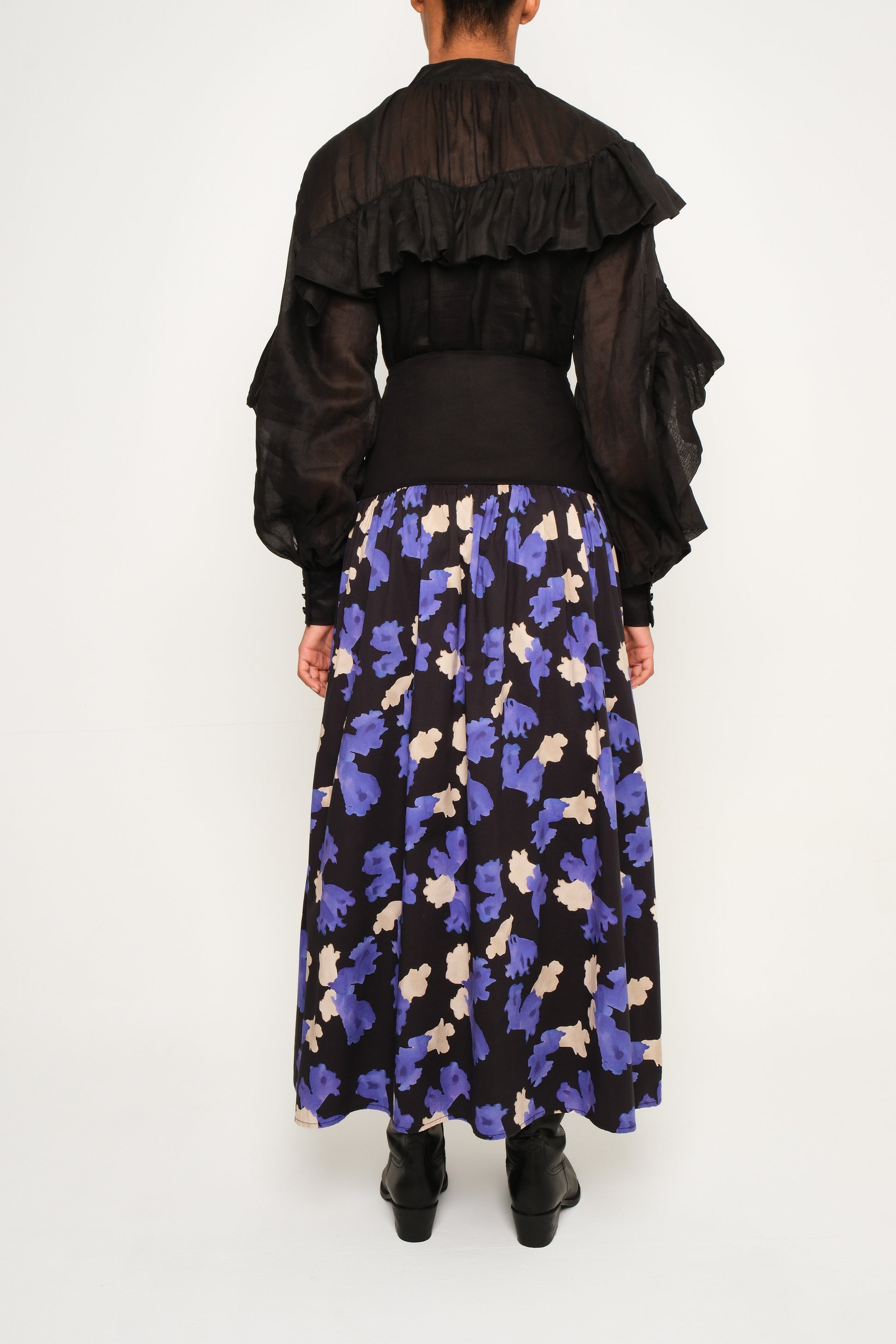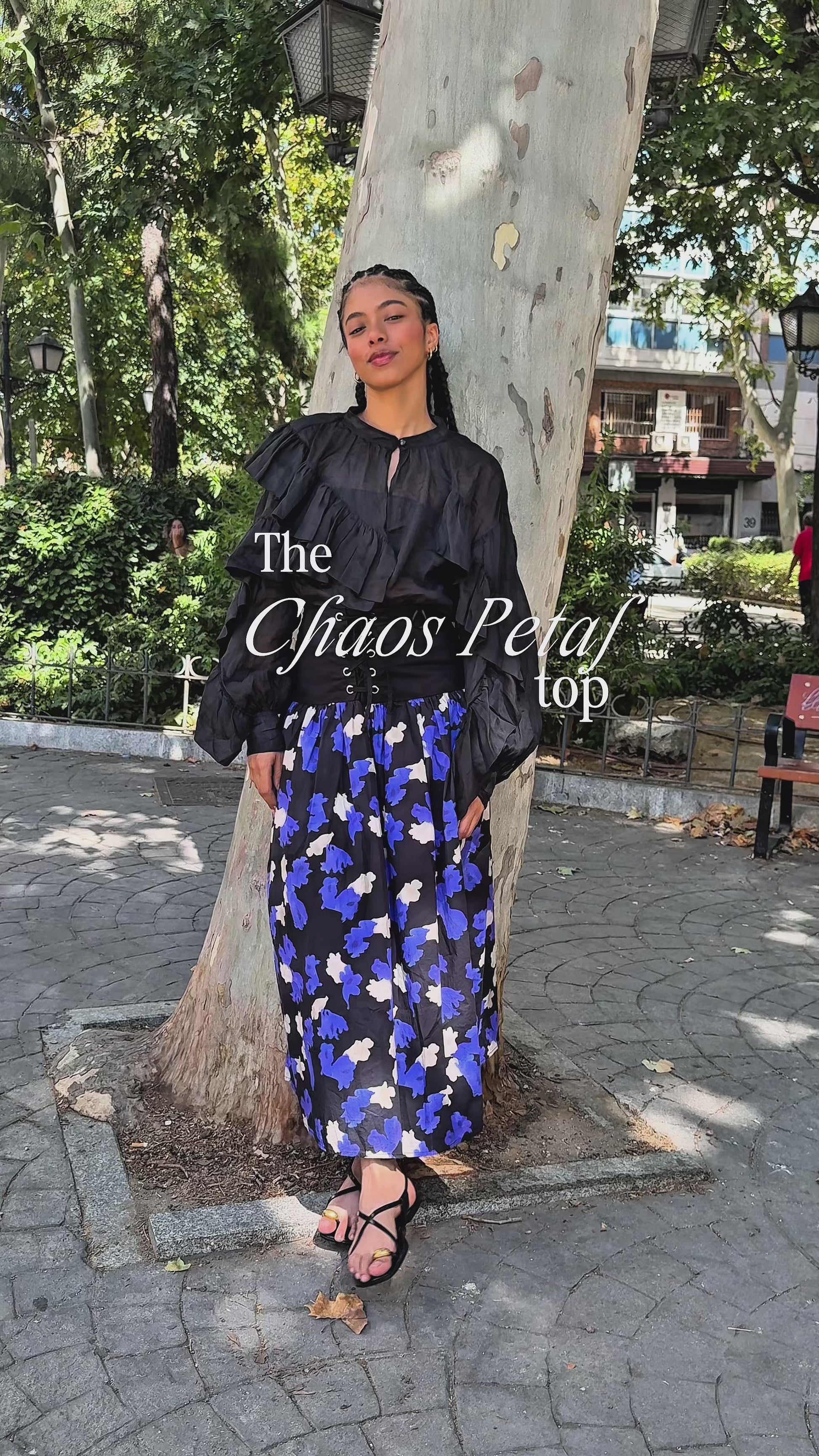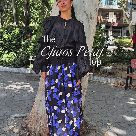 Meet the Chaos Petal Blouse—a dramatic, feather-light layer cut in breathable linen. A high gathered neckline opens to a subtle keyhole with button closure, while cascading ruffles sweep the yoke and sleeves. Voluminous balloon sleeves taper into structured cuffs, balancing movement with polish. Semi-sheer and fluid, it’s the black blouse that elevates everything from denim to evening skirts.