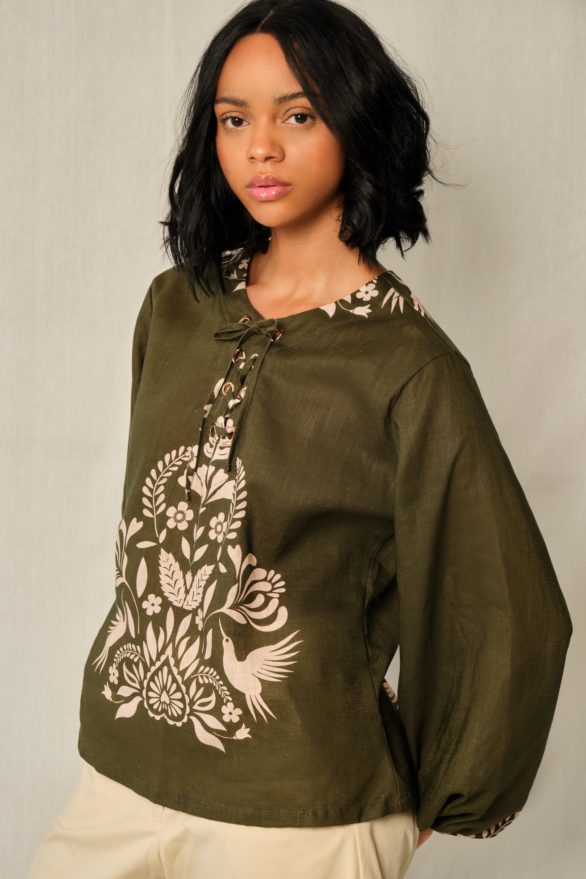 Top  with voluminous balloon sleeves and a lace-up neckline detail.