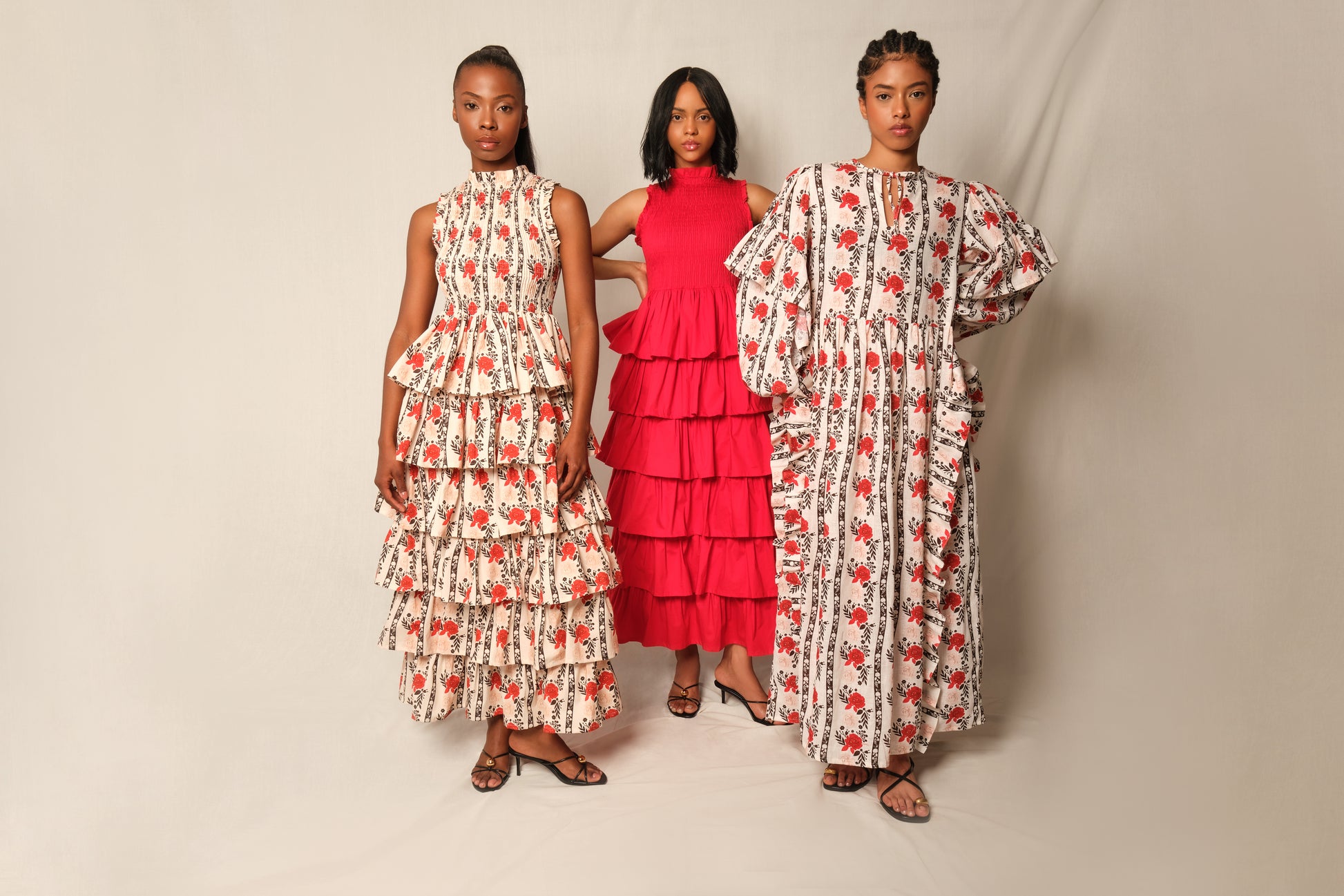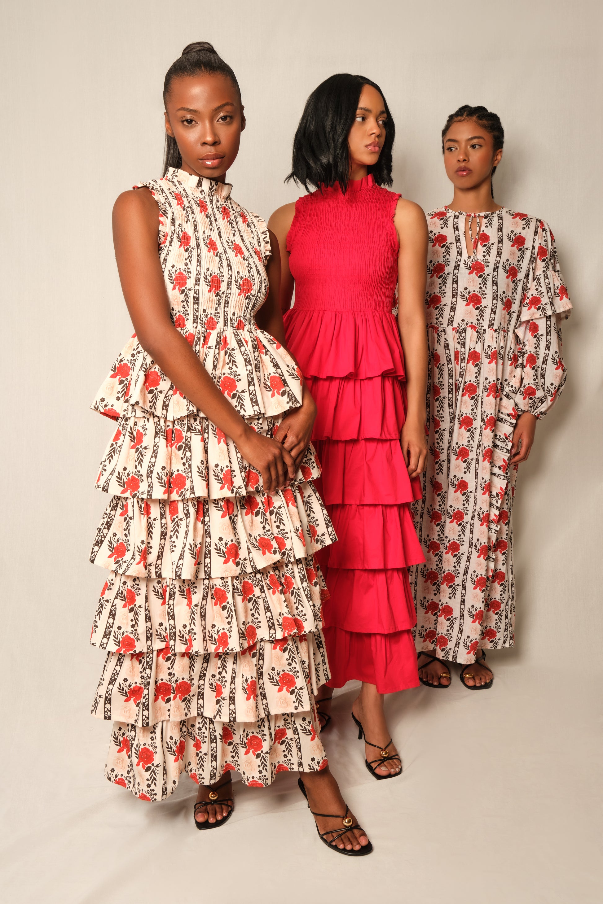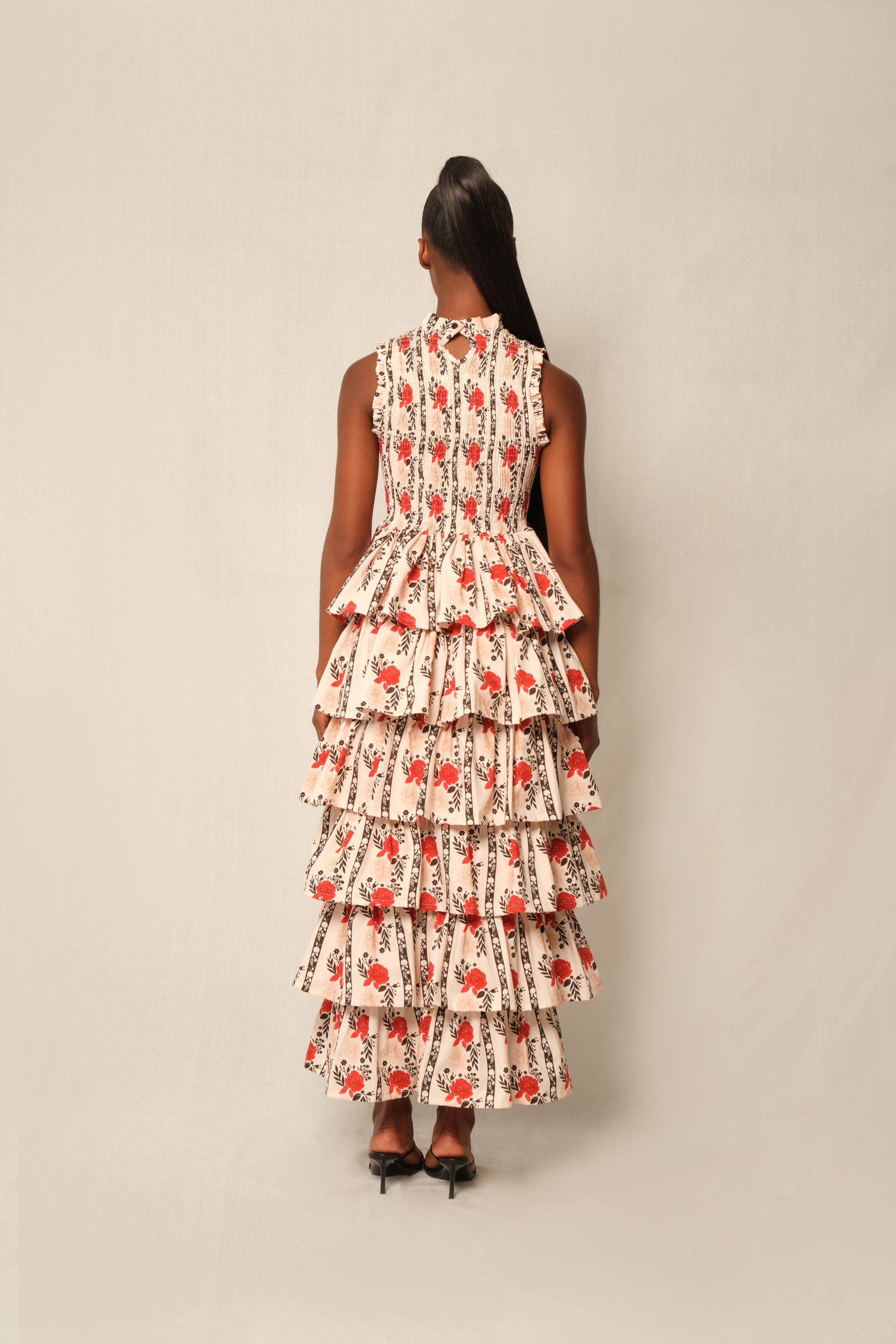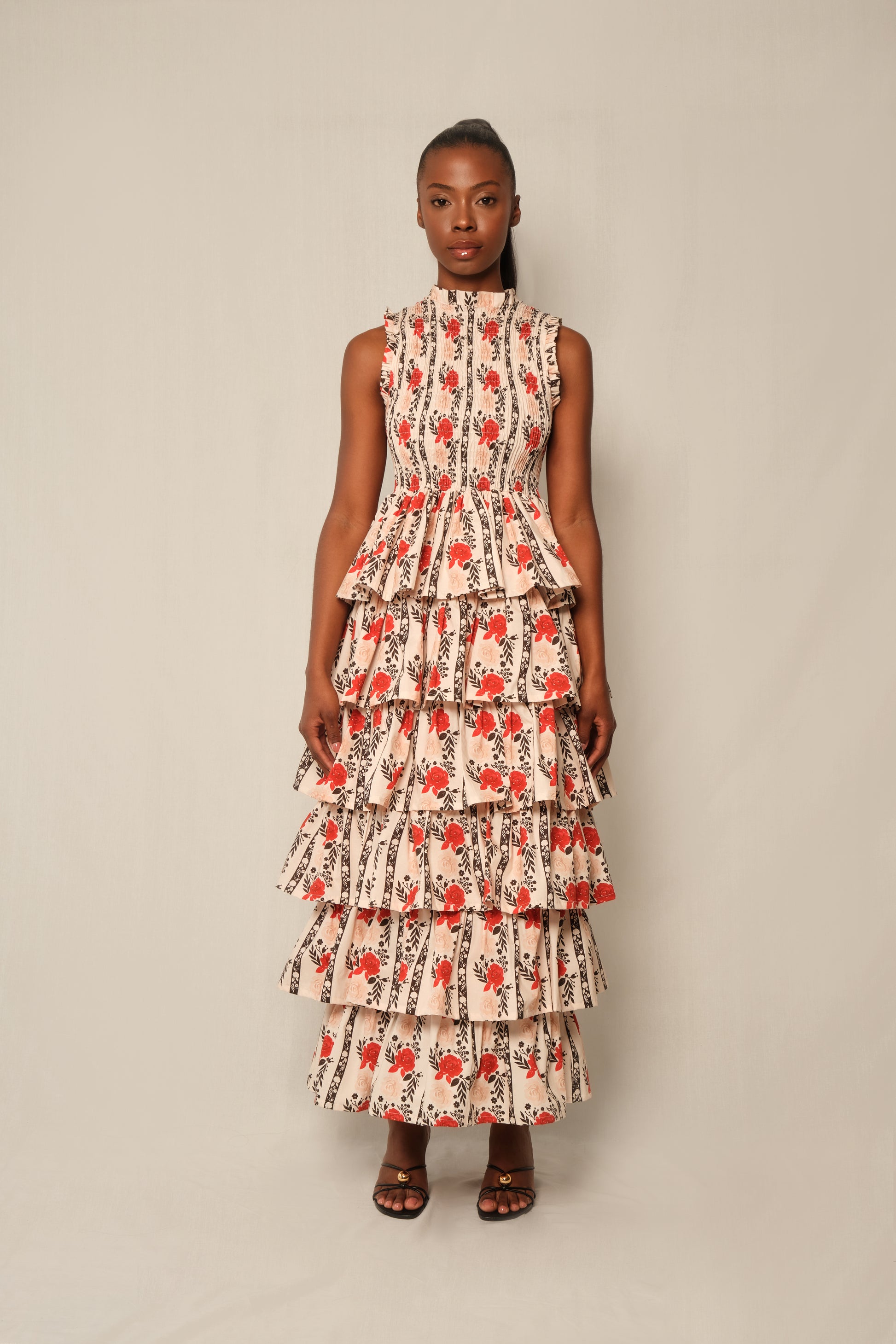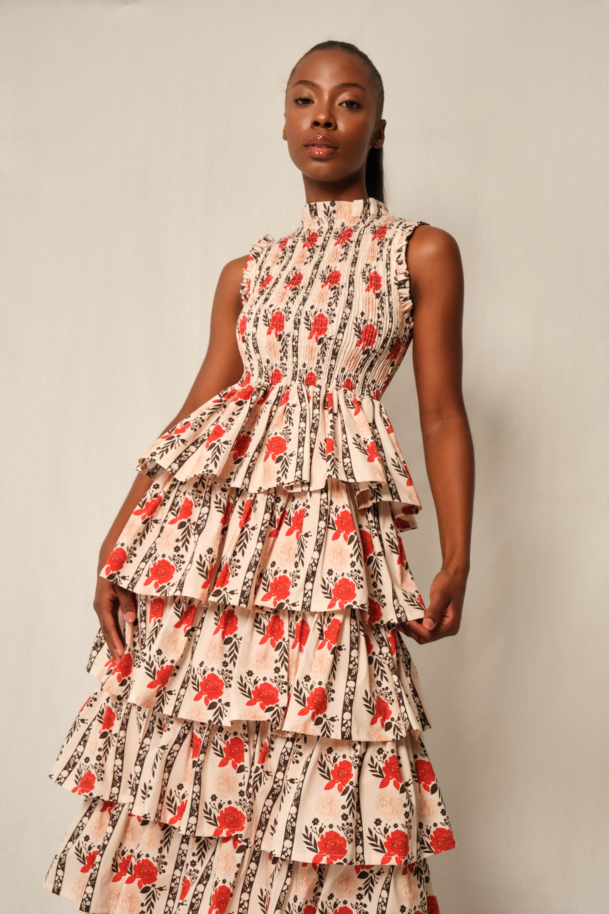 Statement tiered maxi dress with a fully smocked bodice and high ruffled neckline. Designed with cascading voluminous layers for maximum drama and movement.