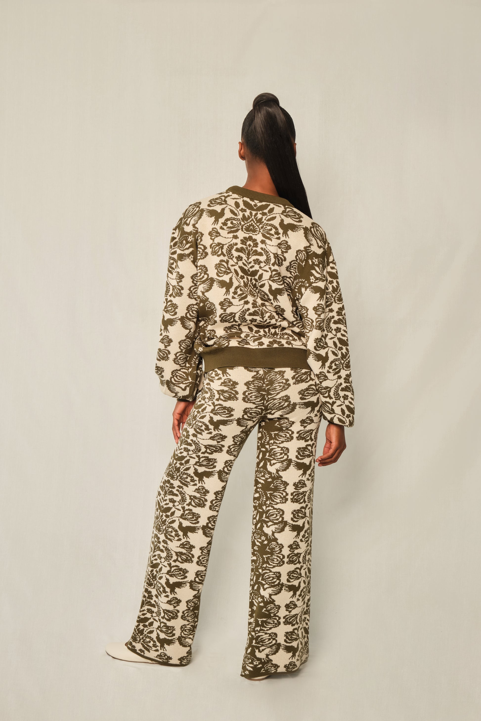 The Green Folk Paisley print adds depth and character, while the knit construction offers softness and structure in equal measure. Easy to wear and easy to style, this pullover anchors a look without overpowering it — relaxed, modern, and quietly expressive.